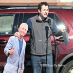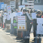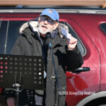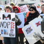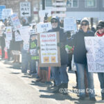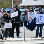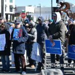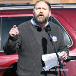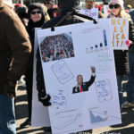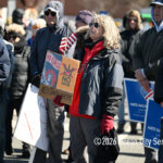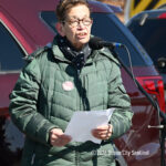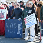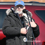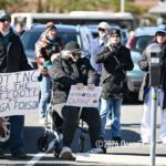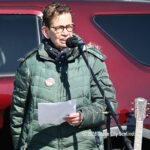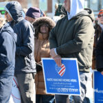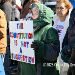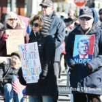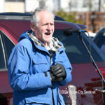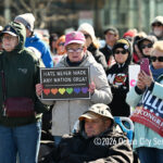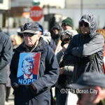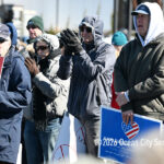 Moved to the Transportation Center parking lot because of construction at the corner of Bay Avenue and Ninth Street, sign-carrying protesters, bundled up against the morning’s chill and strong winds, cheered along to speeches dominated by political candidates.