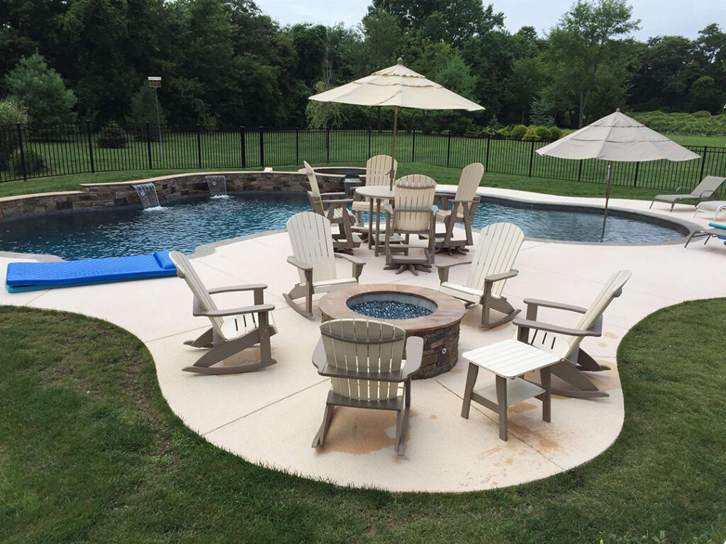 A series of decks meanders down from the back door, cascading down the length of the house, bordered by dueling outdoor showers and leading to an enormous swimming pool, complete with multiple waterfalls from a decorative rock wall, surrounded by a patio ending in a fire pit.